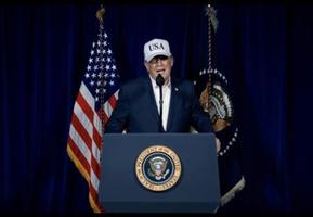 トランプ氏は「USA」と書かれた白い帽子をかぶり演説。昨年6月に米軍がイランの核施設を攻撃して以降、核兵器開発を追求しないよう迫ったが、イランが受け入れなかったと訴えた。