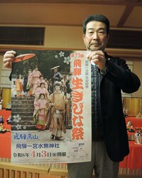 飛騨一宮水無神社「生きびな祭」楽しんで PRポスターが完成 レジャー 2026年3月1日 08:00 ポスターを手にする稲子盛雄飛騨一之宮観光協会事務局長=高山市内 高山市一之宮町の飛騨一宮水無神社(牛丸大吾宮司)で4月3日に開かれる「第73回飛騨生きびな祭」(同神社、蚕糸農業祭奉賛会、岐阜新聞社、岐阜放送主催)のPRポスターが出来上がった。 旧暦の桃の節句... 全文:279文字 この記事をお読みいただくには「デジタルプラン」または「宅配+デジタルプラン」の会員登録が必要です。無料会員の方はログインしてマイページからコース変更してください。デジタルプランまたは宅配+デジタルプランをご登録中の方はログインしてください。 岐阜新聞デジタル会員に登録すると 無料会員向け記事が読める ニュースレターで最新情報が受け取れる デジタルプラン、宅配+デジタルプランなら Webオリジナルコンテンツが読める 紙面ビューアが読める チケットの先行発売に参加できる お得なクーポンが使える 新規登録ページ ログインページ トップ 岐阜のニュース レジャー 飛騨一宮水無神社「生きびな祭」楽しんで PRポスターが完成 関連記事 高山市と飛騨市の選挙区「合区」案 来春の岐阜県議選、県政自民クラブが提示 墨の祭典「岐阜県書作展」が開幕 軸装の美、書129点 岐阜県で今週末どこ行こう?【2月28日、3月1日】 春の中華バイキング、40種類からオーダー 大垣フォーラムホテル「萬里」 ★掃除機を盗んだ疑い 高山市ソフト壮実年・女子協会 新会長に宮ノ脇さん 新体制報告 中島さんは相談役に おすすめ記事 FC岐阜4連勝 開幕からJ2勢連破止まらず 百年構想リーグ 飛騨一宮水無神社「生きびな祭」楽しんで PRポスターが完成 本巣消防署が新築移転、竣工式 岐阜地域の消防広域化で4月運用スタート 山岳救助想定の訓練施設も ぶんけいカップ岐阜県少年サッカー大会が開幕 決勝トーナメント進出の8強決まる