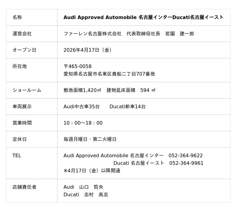 ドイツを代表する名門自動車ブランド「Audi」の認定中古車販売店「Audi Approved Automobile 名古屋インター」とイタリアの名門モーターサイクルブランド「Ducati」の正規販売店「ドゥカティ名古屋イースト」を、日本で初めて一つに集約した新拠点として、