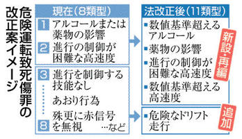 危険運転11類型に拡大 速度やアルコール数値新設 法改正案 「数値なし」も維持 2026年3月3日 05:00 政府が今国会に提出予定の自動車運... 残り693文字(全文:710文字) この記事をお読みいただくには「デジタルプラン」または「宅配+デジタルプラン」の会員登録が必要です。無料会員の方はログインしてマイページからコース変更してください。デジタルプランまたは宅配+デジタルプランをご登録中の方はログインしてください。 岐阜新聞デジタル会員に登録すると 無料会員向け記事が読める ニュースレターで最新情報が受け取れる デジタルプラン、宅配+デジタルプランなら Webオリジナルコンテンツが読める 紙面ビューアが読める チケットの先行発売に参加できる お得なクーポンが使える 新規登録ページ ログインページ トップ 岐阜のニュース 危険運転11類型に拡大 速度やアルコール数値新設 法改正案 「数値なし」も維持 関連記事 ぎふサテ! 午後4時59分~ 「がんを抑制」とサプリ販売疑い 会社代表ら再逮捕 神社に油かけたか 日本人医師逮捕へ 米国から引き渡し 千葉県警 社長「同業他社に出航是非聞かず」 知床沈没公判 県観光連盟元職員 詐欺罪で追起訴 岐阜地検 一攫千金狙い加担 組織へ「怖さと憧れ」 おすすめ記事 長良川競技場は「ヒマラヤスタジアム岐阜」に ネーミングライツ決まる 鍛治舎巧さん「No.1への道」 ゲーム戦術の展開【攻撃編】基本となる戦術 岐阜県初ラグビー専門店、大垣市にオープン ジム機能整備、選手育成想定した体幹指導も 可児市のアーラ、音楽で被災地へ祈り 3月8日にコンサート