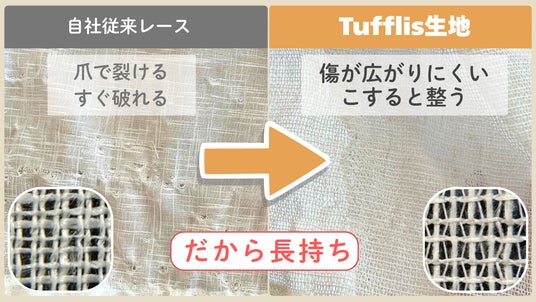 自社従来品のレースカーテンとの比較検証を実施し、猫の引っかき傷に対する傷の広がりにくさを確認いたしました。