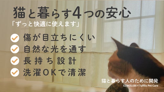 株式会社アバンティが運営するインテリアブランド「COMOLEBI(所在地:愛知県一宮市)」は、昨年発売しご好評をいただいた、猫の引っかき傷が目立ちにくい特殊織り構造のレースカーテン「Tufflis(タフリス)」をさらに進化させた、猫特化型モデル「Tufflis Pet Care(タフリス ペットケア)」を開発いたしました。