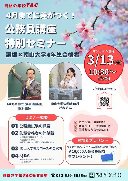 資格取得に向けた教育サービスを展開しているTAC株式会社(東京都千代田区、代表取締役社長:多田 敏男)では、公務員試験を検討されている南山大学生へ向けて「4月までに差がつく!公務員講座 特別セミナー」をオンラインで開催します。