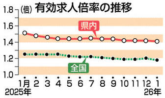 1月の県内有効求人1・41倍 3カ月ぶりに低下 経済 2026年3月4日 05:00 岐阜労働局が3日発表した1月の県... 残り604文字(全文:621文字) この記事をお読みいただくには「デジタルプラン」または「宅配+デジタルプラン」の会員登録が必要です。無料会員の方はログインしてマイページからコース変更してください。デジタルプランまたは宅配+デジタルプランをご登録中の方はログインしてください。 岐阜新聞デジタル会員に登録すると 無料会員向け記事が読める ニュースレターで最新情報が受け取れる デジタルプラン、宅配+デジタルプランなら Webオリジナルコンテンツが読める 紙面ビューアが読める チケットの先行発売に参加できる お得なクーポンが使える 新規登録ページ ログインページ トップ 岐阜のニュース 経済 1月の県内有効求人1・41倍 3カ月ぶりに低下 関連記事 大垣共立銀行130周年記念で特設サイト開設 夢実現プロジェクト当選者発表 岐阜県内企業も中東事業に影響 輸送ストップ、エネルギー価格上昇懸念 県内主要小売店1月売上高 4社が前年上回る 近況 工匠館の兼松利昌社長 大垣共立銀行、創立130周年 林頭取「次の10年へ」決意語る 地域のために、軸足守る 物価高上回る賃上げ実現を 連合岐阜が総決起集会 おすすめ記事 あなたの町ではいくら? 岐阜42市町村の物価高支援を調査 最大3万3千円 公衆浴場の料金、岐阜県が引き上げ 3年ぶり、4月から 【速報】可児市の大王製紙工場、男性6人救急搬送 作業中にガス吸引か 鍛治舎巧さん「No.1への道」 ゲーム戦術の展開【攻撃編】年間を通して実行する戦術