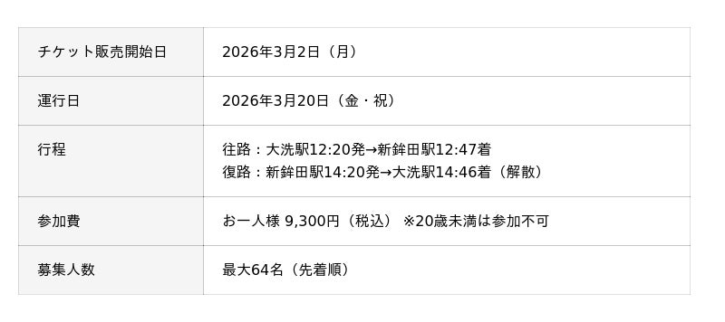 ・ 限定運行:2026年3月20日(金・祝)の昼限定で、最大64名の募集となります(先着順)。