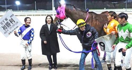 着順掲示板でコパカツの1着が確定。小笠原羚騎手が「宮下瞳調教師初勝利」のプラカードを持った。なかなか立ち止まってくれず、元気いっぱいのコパカツとの初勝利の口取りは最高だった。宮下調教師は「ありがとう今井さん、ホッとした」と感謝。「一発目が俺で良かった」という今井騎手。初Ⅴは第1号として名前が残るし「一発目は俺が勝ちてえなと思っとったんで」とにっこり。