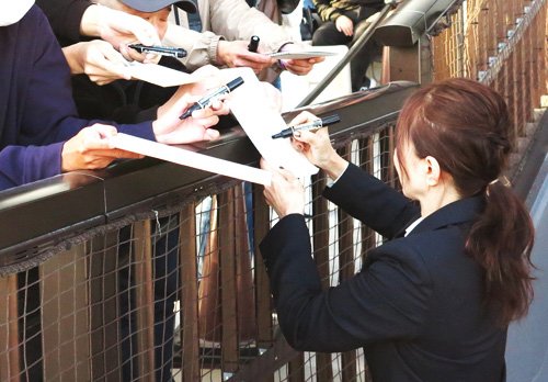 スタンドからは身を乗り出したファンたちが「競馬ブロス(テレビ番組)やツイッター見ました」などと宮下調教師に色紙や馬券などへのサインを求めた。「また頑張ってください。応援しています」。日本一の女性ジョッキーから調教師になっても人気は素晴らしく、宮下ファンたちが勝利を祝福した。