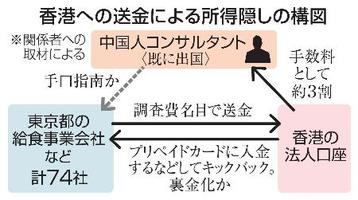 関係者によると、所得隠しを指摘されたのは、東京都の給食事業会社や大阪市の飲食店経営会社など。手口は、各社が指定された香港の法人口座に調査費名目で送金。コンサルタント側が手数料として約3割を差し引いた後、残金が入ったプリペイドカードを渡す形で会社側にキックバックしていた。コンサルタントとは経営者向け交流会で知り合ったとみられる。