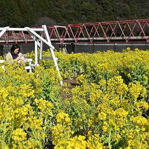 美濃市下河和の「洲原ひまわりの里」で、鮮やかな黄色の菜の花が咲きそろい、訪れた人を楽しませている。見頃は今月中旬まで。