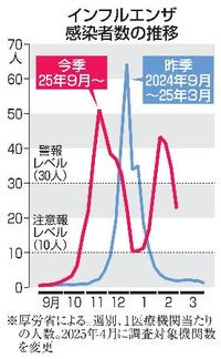 今季は当初、A香港型(AH3型)ウイルスの新たな変異株が流行した。感染者数はいったん減少したが、昨年末以降、B型の検出割合が増加。A型にかかった人が、B型に再び感染することもあり、警報レベルを超える感染が広がっていた。