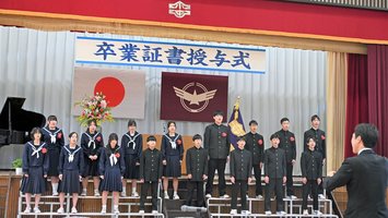 本年度で閉校する恵那市串原の串原中学校で6日、最後の卒業式が開かれ、3年生9人が慣れ親しんだ学び舎(や)を巣立った。中山太鼓保存会少年部の最後の免許状授与式もあり、卒業生9人に加え、在校生7人にも保存会から中山太鼓の担い手の証しが贈られた。