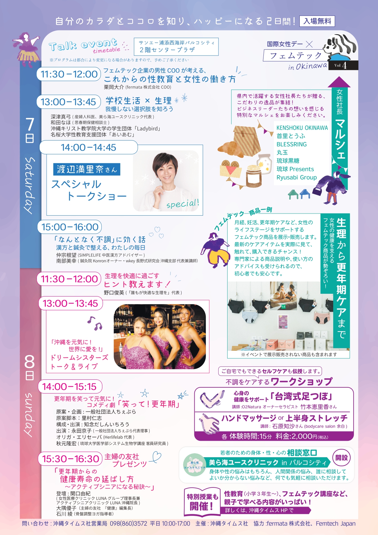 株式会社沖縄タイムス社(那覇市、瑞慶山秀彦社長)は、生理や更年期など女性特有の健康課題の解決と女性のエンパワーメントを目的に、3月7日(土)、8日(日)に、サンエー浦添西海岸パルコシティで「国際女性デー×フェムテックVol4」を開催します。