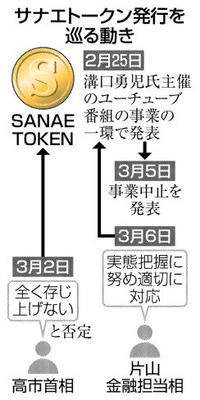 サナエトークン中止 「推し活」名目の仮想通貨 首相が関与否定、急落 2026年3月7日 05:00 高市早苗首相の名前を冠した暗号資... 残り645文字(全文:662文字) この記事をお読みいただくには「デジタルプラン」または「宅配+デジタルプラン」の会員登録が必要です。無料会員の方はログインしてマイページからコース変更してください。デジタルプランまたは宅配+デジタルプランをご登録中の方はログインしてください。 岐阜新聞デジタル会員に登録すると 無料会員向け記事が読める ニュースレターで最新情報が受け取れる デジタルプラン、宅配+デジタルプランなら Webオリジナルコンテンツが読める 紙面ビューアが読める チケットの先行発売に参加できる お得なクーポンが使える 新規登録ページ ログインページ トップ 岐阜のニュース サナエトークン中止 「推し活」名目の仮想通貨 首相が関与否定、急落 関連記事 フェンシング国内ランク1位・村瀬(岐阜総合高出)強豪の日体大へ 母と二人三脚で成長 ドイツ仕込みの自家製ハムやソーセージ販売「森本工房」初店舗、大野町にオープン 警察署で「話をさせろ」ナイフ振り回す 公務執行妨害の疑い、岐阜市の男逮捕 工場敷地に保育施設を開園 大阪シーリング印刷、大垣市に ★岡林が負傷交代 伊藤今季初○ おすすめ記事 フェンシング国内ランク1位・村瀬(岐阜総合高出)強豪の日体大へ 母と二人三脚で成長 【スコア速報】第43回岐阜オープンクラシック2026開幕 プロ・アマ頂上決戦 キャンピングカー横転、大型トラック2台衝突 瑞浪市の中央道 みこしパレードは中止 岐阜市の「道三まつり」 天候不順で一部イベント変更