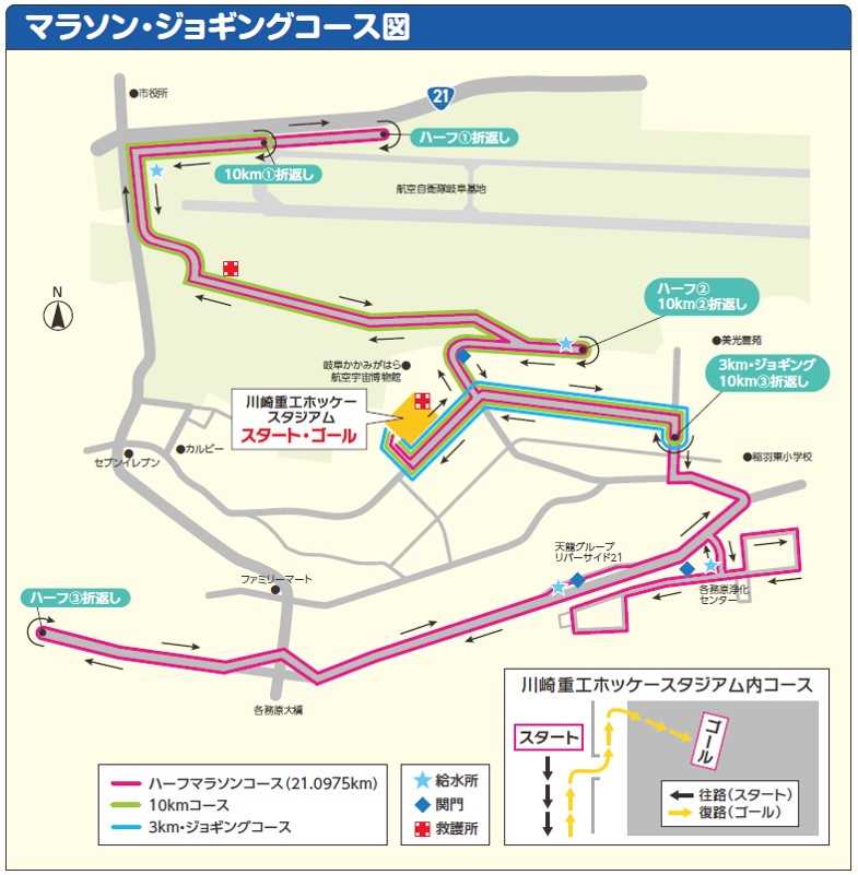 「第33回かかみがはらシティマラソン2026」が8日、各務原市下切町の川崎重工ホッケースタジアムを発着点に、航空自衛隊岐阜基地内と市街地を走るコースで開かれる。7日には発着点周辺にのぼりが掲げられ、大会ムードを盛り上げている。