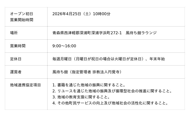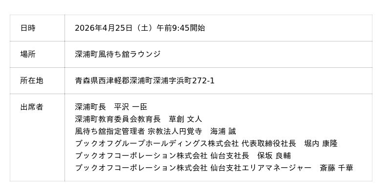 青森県西津軽郡深浦町と、書籍を通じた地域振興の取り組み等を行う地域連携協定を2026年2月27日(金)に締結し、2026年4月25日(土)10時に中古本の販売サービスを通じてコミュニティスペースを提供する「ふるさとブックオフ」3号店を深浦町風待ち舘内にオープンいたします。深浦町は人口減少に伴い、2005年3月の合併前後から長年にわたり書店がない自治体で、子どもを始めとする町民の読書機会が限られてしまうことに課題がありました。こういった課題がある中、2023年8月にオープンした岩手県西和賀町店、2024年4月にオープンした三重県木曽岬町店のことを知り、ぜひ深浦町にも「ふるさとブックオフ」をオープンさせたいと深浦町役場の方からお問い合わせいただいたことをきっかけに実現いたしました。