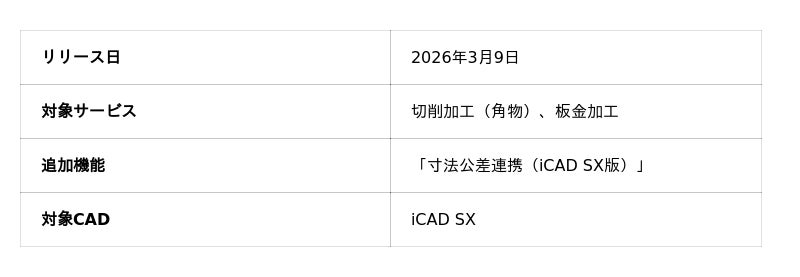 機械部品調達のAIプラットフォーム「meviy(メビー)」(サービス提供元:株式会社ミスミグループ本社)は、2026年3月9日より、iCAD株式会社が提供する機械設計向け3DCAD 「iCAD SX」で設定した寸法公差情報の自動連携機能「寸法公差連携(iCAD SX版)」の提供を開始します。本機能により、「iCAD SX」で設定した寸法公差情報をそのままmeviyの見積条件へ自動反映できるようになります。本機能により、従来、meviyで再設定していた寸法公差の設定が不要となり、見積もりにかかる工数を従来比で25%削減します。