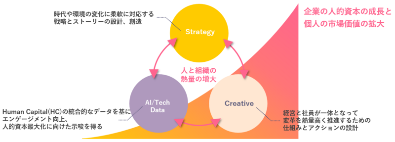 こうした課題感を受けて、当センターは、事業と人事、戦略と施策などさまざまな要素をつなぎ合わせ、一つのストーリーで人と組織の熱量を上げ、価値創造と競争優位をクライアントへ提供し、企業の人的資本の成長と、個人の市場価値の拡大を実現します。