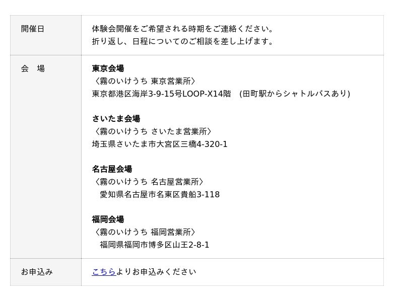 株式会社いけうち(霧のいけうち、本社:大阪府大阪市西区)は、令和8年3月より全国5拠点(大阪・東京・さいたま・名古屋・福岡)において、熱中症対策・ミスト冷房システム体験会を開催いたします。