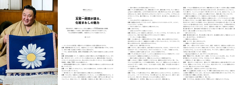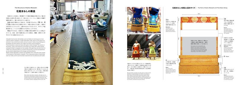 本書では、普段は見ることのできない下絵やデザイン図案、相撲博物館に所蔵されている貴重な化粧まわしや力士の着姿写真などを、すべて解説つきで紹介(日英バイリンガル表記、オールカラー208 頁)。化粧まわしの仕立て職人や着物(京友禅)の老舗、締め込みの織物工房などの製作現場にも取材撮影&収録しています。