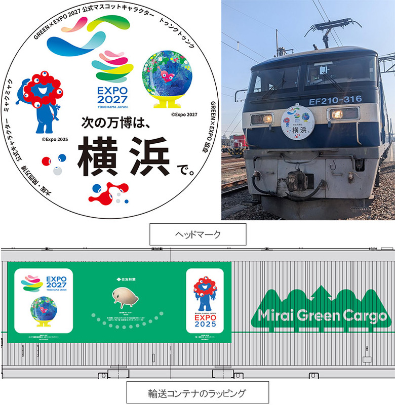 ■日本貨物鉄道株式会社(JR貨物): 大阪・関西万博に近い安治川口駅からGREEN×EXPO 2027会場に向け、貨物鉄道で樹木を輸送し、レガシー継承のつなぎ役を担当いたしました。また、記念のヘッドマークを作成しました。