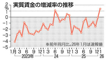 実質賃金13カ月ぶりプラス 1月、物価上昇鈍化が要因 2026年3月10日 05:00 厚生労働省が9日公表した1月の毎... 残り636文字(全文:653文字) この記事をお読みいただくには「デジタルプラン」または「宅配+デジタルプラン」の会員登録が必要です。無料会員の方はログインしてマイページからコース変更してください。デジタルプランまたは宅配+デジタルプランをご登録中の方はログインしてください。 岐阜新聞デジタル会員に登録すると 無料会員向け記事が読める ニュースレターで最新情報が受け取れる デジタルプラン、宅配+デジタルプランなら Webオリジナルコンテンツが読める 紙面ビューアが読める チケットの先行発売に参加できる お得なクーポンが使える 新規登録ページ ログインページ トップ 岐阜のニュース 実質賃金13カ月ぶりプラス 1月、物価上昇鈍化が要因 関連記事 ぎふサテ! 午後4時59分~ 岐阜市の70代に電話「マネロン容疑かかってる」 地金1キロ詐取被害 特殊詐欺で1990万円被害 各務原の50代男性 岐阜市のコンビニ強盗疑いで男逮捕 岐阜北署 催涙スプレーを誤噴射、10人搬送 兵庫の児童クラブ どの花見ても♪きれいだな 木曽三川公園 おすすめ記事 岐阜市で2400万円相当の金の地金だまし取られる 70代男性被害、特殊詐欺か 桜彩るコースでプロアマ戦 岐阜オープン4日開幕、5日決勝は生中継 ホリエモン監修カレーが岐阜に初上陸! 出汁にこだわり、なぜかラーメン店で提供 飛騨生きびな祭、あす3日開催 飛騨一宮水無神社