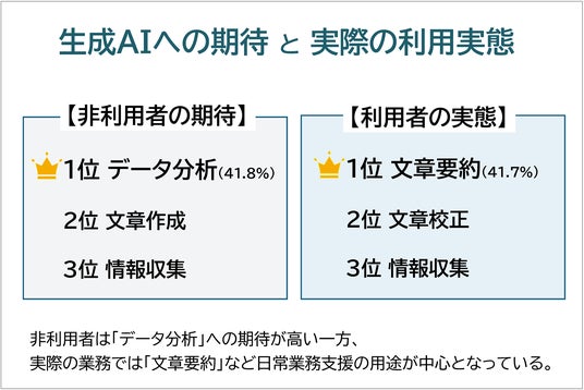 生成AIを利用していない回答者が「利用してみたい業務」として最も多く挙げたのはデータ分析(41.8%)であった。一方、実際の利用では文章要約(41.7%)など日常業務支援が多く、期待される用途と現場での活用には違いが見られた。