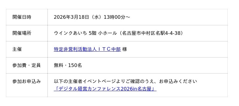 株式会社テクノア(本社:岐阜県岐阜市、代表取締役:山崎 耕治)は、2026年3月18日(水)に開催される「デジタル経営カンファレンス2026in名古屋」(主催:特定非営利活動法人ITC中部 様)に、開発本部 本部長 大原 隆寛が登壇することをお知らせします。
