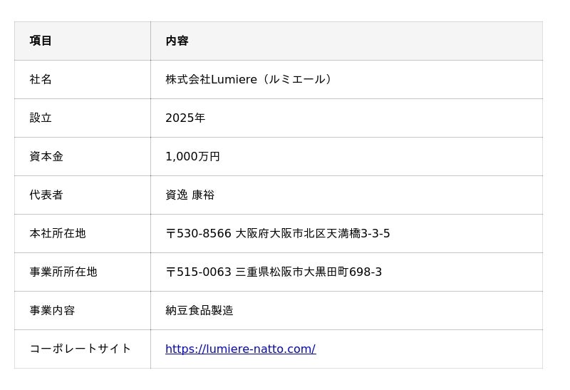 「発酵の力で、日常に新しい光を。」をコンセプトに掲げる株式会社Lumiereは、昔ながらの納豆づくりを大切にしながら、発酵食品の新しい可能性を日々追求しています。三重県松阪市に事業所を構え、地元の食文化と向き合いながら、素材の個性を活かした商品開発に取り組んでいます。これからも「発酵」を軸に、食卓に新しい発見と喜びをお届けしてまいります。最新情報はコーポレートサイトや公式SNSにて随時発信中です。ぜひご覧ください。
