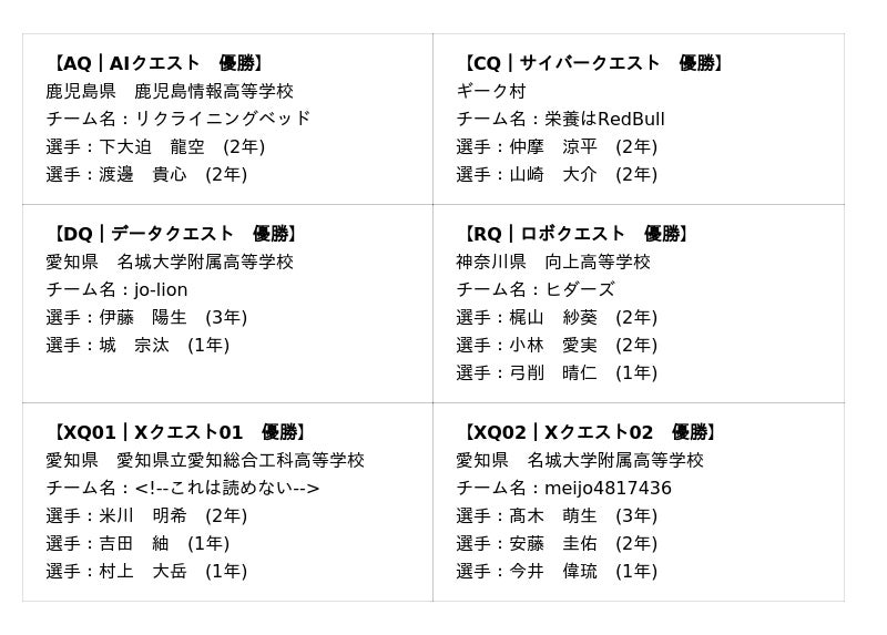 レベルが底上げされるセキュリティ競技。強豪の頂上決戦を制したのは初出場の新星。年々競技レベルが上昇する中、注目は前回全問クリアの武蔵高等学校「hiikunZ」と1問差で2位の高崎北高等学校「はみ出していけ自由の彼方」による頂上決戦でした。両チームは昨年11月に競技開発企業の社内コンテストへ招待され社会人と共に好成績を残した最強チームです。しかし今大会では予想に反し、初出場の混合個人チーム「栄養はRedBull」が2チームを抑えて初優勝を飾りました!高校生ホワイトハッカーの急成長から目が離せません!!