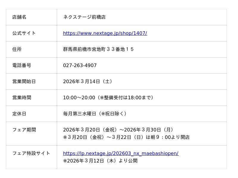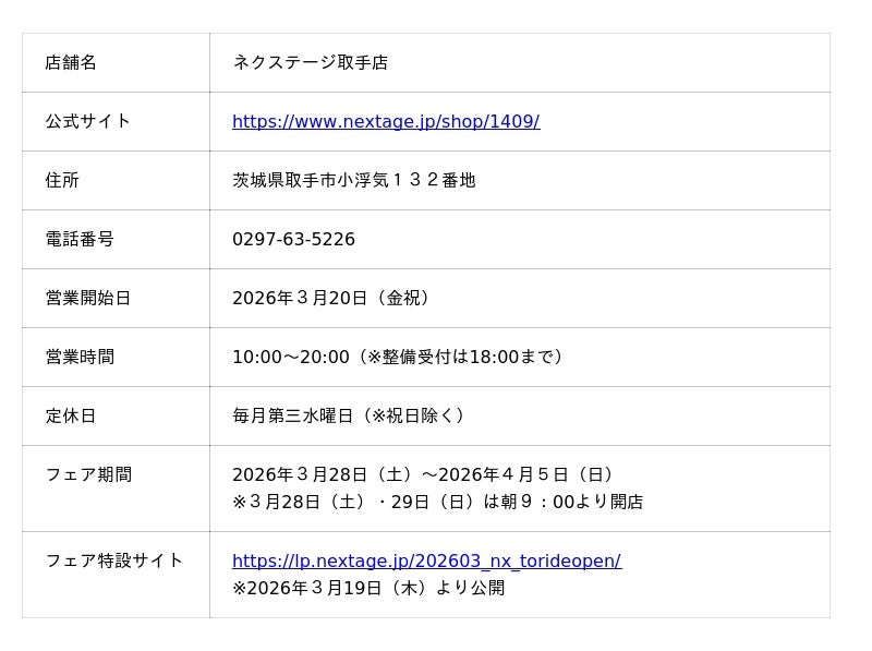 3月20日(金祝)に『ネクステージ前橋店』(群馬県前橋市)、3月28日(土)に『ネクステージ取手店』(茨城県取手市)をグランドオープン。これにより、群馬県は4拠点、茨城県は5拠点体制となり、北関東圏にお住まいのお客様にとって、より身近で利便性の高いサービスを提供してまいります。