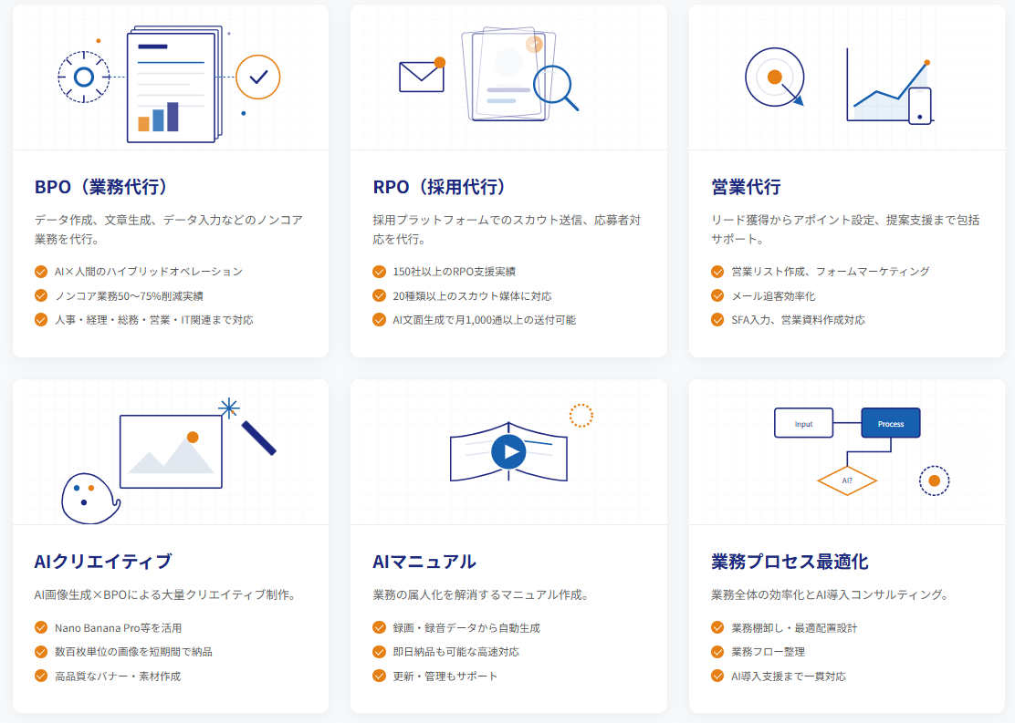 営業活動におけるデータ整理や商談ログの加工、AI活用を前提とした業務設計など、間接業務を外部化・効率化したい企業にとって、柔軟な選択肢を提供いたします。