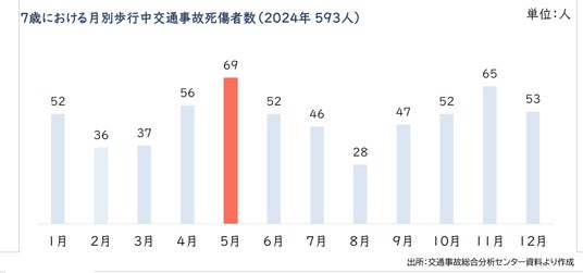 7歳頃の児童の交通事故が多い背景として、小学校入学を機に登下校等で一人での行動が始まる一方で、小学3年生頃までは危険を察知し、回避する能力が未発達であるため、歩行中の交通事故が最も多いことが分かっています。