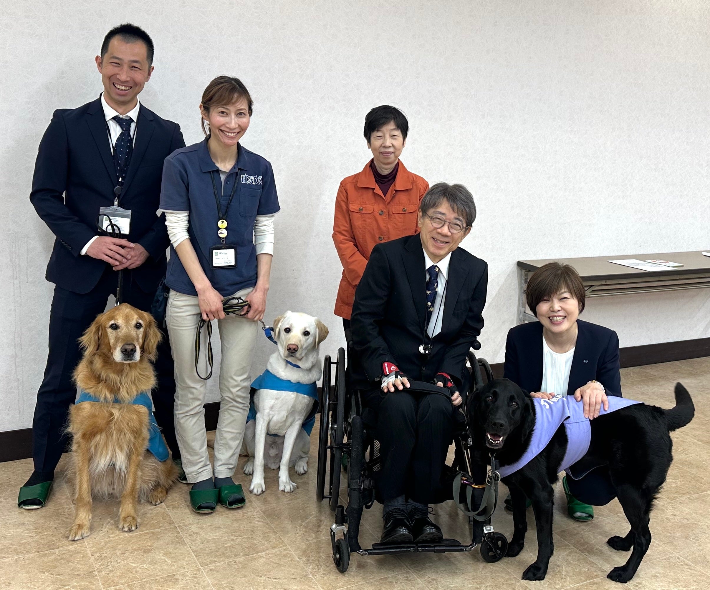 左から兵庫介助犬協会関係者、同協会所属犬、介助犬使用者の木村佳友さん・美智子さん夫妻、四代目介助犬エクラ、当社担当者。当社が2003年に介助犬支援を開始した時から、 木村さんご夫妻との交流が続いています。