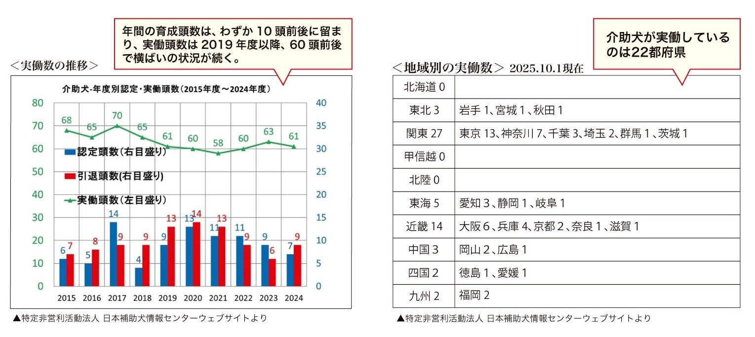 約75年の歴史のある盲導犬と比べ、介助犬は約30年と歴史が浅く、認知度も低く頭数も少ない状況です。2025年10月1日現在の実働頭数は、盲導犬の768頭に対して56頭。介助犬が実働しているのは、下表(地域別の実働数)のように22都府県のみ。介助犬を見かける機会も少ないはずです。訓練事業者の規模も盲導犬に較べて脆弱な団体が多く、年間の育成頭数も盲導犬の百数十頭に対して十頭前後。そのような中、介助犬を必要とする人は約15,000人と言われ、育成が急がれます。