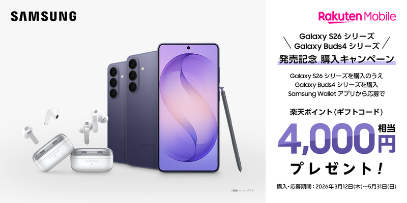 対象期間中に楽天モバイル公式サイト、楽天モバイル公式 楽天市場店、楽天モバイルショップにて「Samsung Galaxy S26シリーズ」と「Samsung Galaxy Buds4 シリーズ」を両方とも購入いただき、Samsung Walletアプリから応募いただきますと楽天ポイント(ギフトコード)をプレゼントいたします。