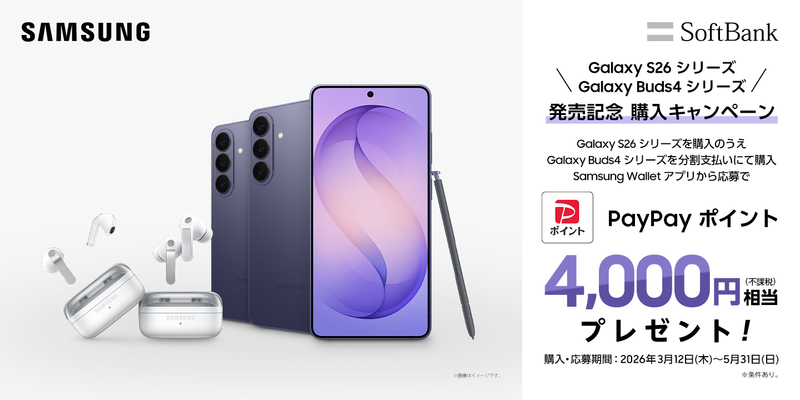 3月12日~5月31日の対象期間中に「Samsung Galaxy S26シリーズ」をご購入、かつ「Samsung Galaxy Buds4 Pro」もしくは「Samsung Galaxy Buds4」を分割払いでご購入・Samsung Walletアプリでご応募いただいたお客様全員に、PayPayポイント4,000円相当をプレゼントいたします。