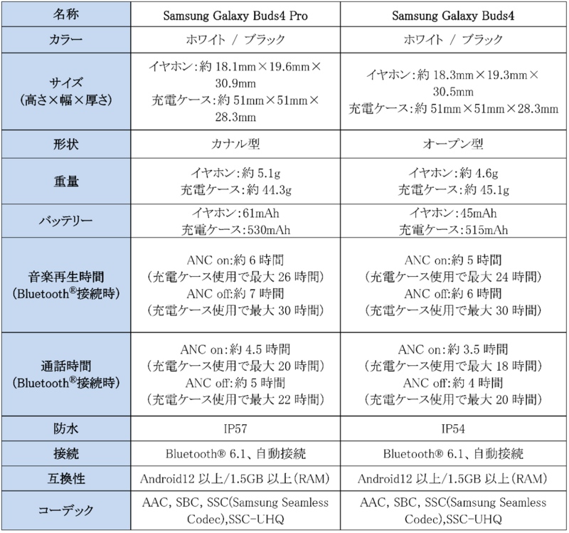 <主な仕様 : 「Samsung Galaxy Buds4 Pro」「Samsung Galaxy Buds4」>