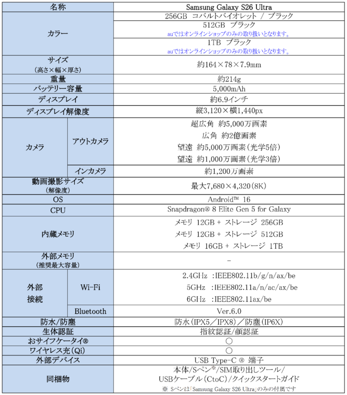 <主な仕様:「Samsung Galaxy S26 Ultra」>