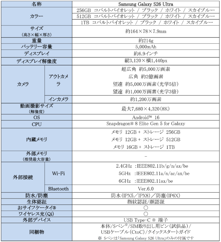 <主な仕様:「Samsung Galaxy S26 Ultra」>