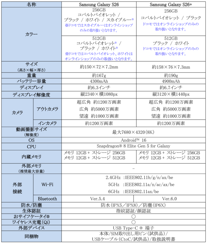 <主な仕様:「Samsung Galaxy S26」、「Samsung Galaxy S26+」>
