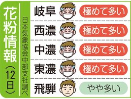 岐阜県内の花粉情報(12日) 2026年3月12日 08:47 岐阜県内の花粉飛散度は、以下の通り... 残り135文字(全文:152文字) この記事をお読みいただくには「デジタルプラン」または「宅配+デジタルプラン」の会員登録が必要です。無料会員の方はログインしてマイページからコース変更してください。デジタルプランまたは宅配+デジタルプランをご登録中の方はログインしてください。 岐阜新聞デジタル会員に登録すると 無料会員向け記事が読める ニュースレターで最新情報が受け取れる デジタルプラン、宅配+デジタルプランなら Webオリジナルコンテンツが読める 紙面ビューアが読める チケットの先行発売に参加できる お得なクーポンが使える 新規登録ページ ログインページ トップ 岐阜のニュース 岐阜県内の花粉情報(12日) 関連記事 岐阜県内の花粉情報(29日) 満開次々! 岐阜県内・桜の開花状況 一覧(3月28日夕 本社調べ) FC岐阜がホームで大勝 暫定1位に 百年構想リーグ 瑞穂市でアパート火災 50代男性死亡 チューリップ祭が開幕 海津市の木曽三川公園センター 早咲きの品種は見頃に アイドルのステージも 岐阜県内の花粉情報(28日) おすすめ記事 川本絶好調!圧巻ハットトリック FC岐阜5発大勝、百年構想リーグ暫定首位に 長良川鉄道の新車両「清流号」発車 長良川の夕闇表すウカイブルー 白川橋100年で虹色ライトアップ 白川町が光源リニューアル バレーボール・JAぎふ、プレーオフ決勝初進出 Vリーグ女子