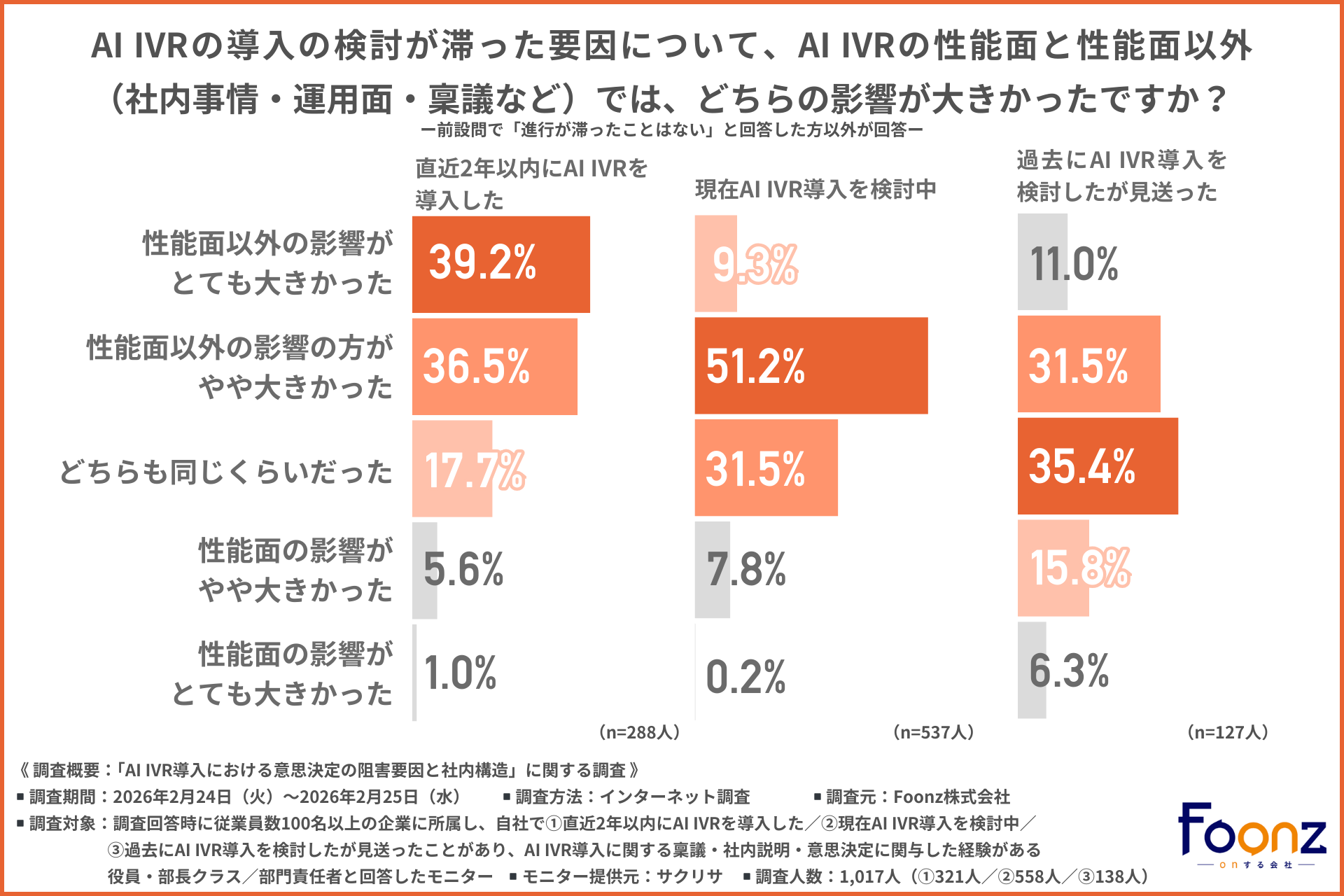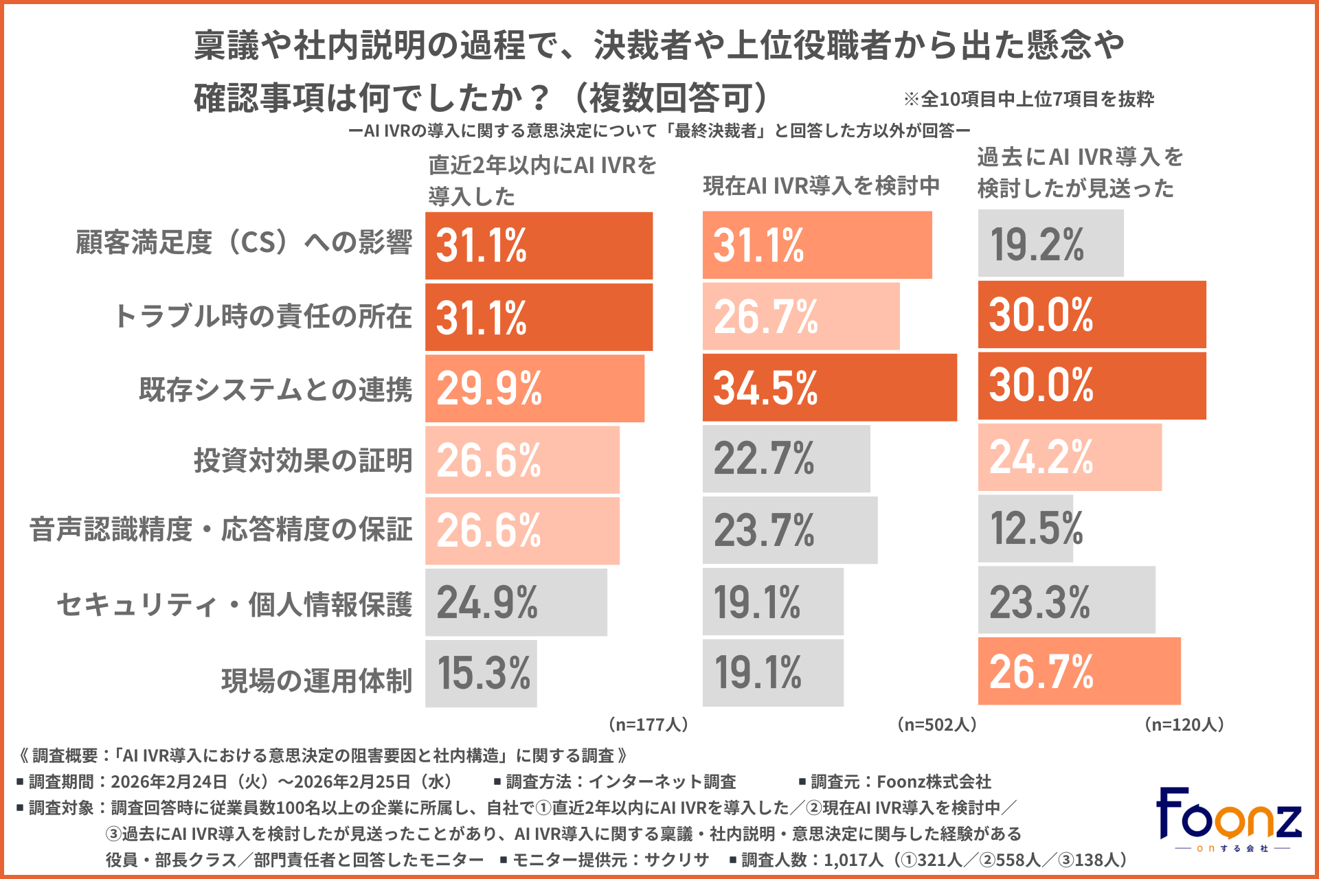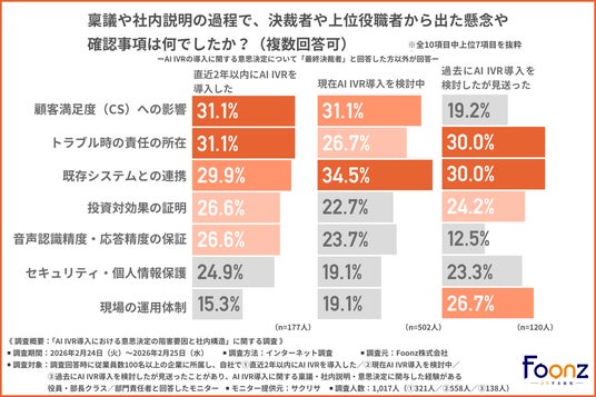 そこで今回、Foonz株式会社(https://foonz.co.jp/)は、従業員数100名以上の企業に所属し、自社で1.直近2年以内にAI IVRを導入した/2.現在AI IVR導入を検討中/3.過去にAI IVR導入を検討したが見送ったことがあり、AI IVR導入に関する稟議・社内説明・意思決定に関与した経験がある役員・部長クラス/部門責任者を対象に、「AI IVR導入における意思決定の阻害要因と社内構造」に関する調査を実施しました。