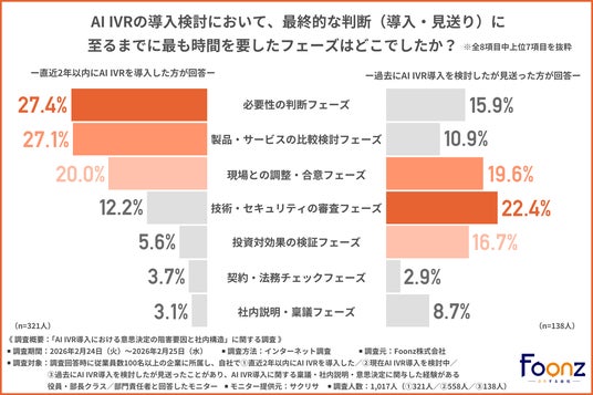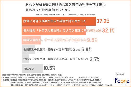 Foonz株式会社(所在地:神奈川県横浜市西区、代表取締役:星野 純一)は、従業員数100名以上の企業に所属し、自社で1.直近2年以内にAI IVRを導入した/2.現在AI IVR導入を検討中/3.過去にAI IVR導入を検討したが見送ったことがあり、AI IVR導入に関する稟議・社内説明・意思決定に関与した経験がある役員・部長クラス/部門責任者を対象に、「AI IVR導入における意思決定の阻害要因と社内構造」に関する調査を実施しました。