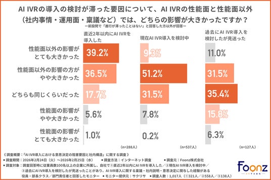 前の質問で『進行が滞ったことはない』と回答した方以外に、「AI IVRの導入の検討が滞った要因について、AI IVRの性能面と性能面以外(社内事情・運用面・稟議など)では、どちらの影響が大きかったか」と尋ねたところ、以下のような回答結果になりました。