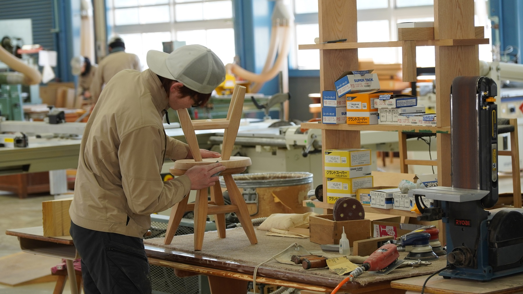 昭和21年に高山建具工補導所として開所し、約80年の歴史を持つ「岐阜県立木工芸術スクール」では、家具業界で活躍する人材を育成するため、経験豊富な専任スタッフに加え、家具業界初の「現代の名工」認定者、職人歴40年以上の曲げ木職人、個人工房作家など、飛騨の木工業界を代表する方々が講師を務めています。