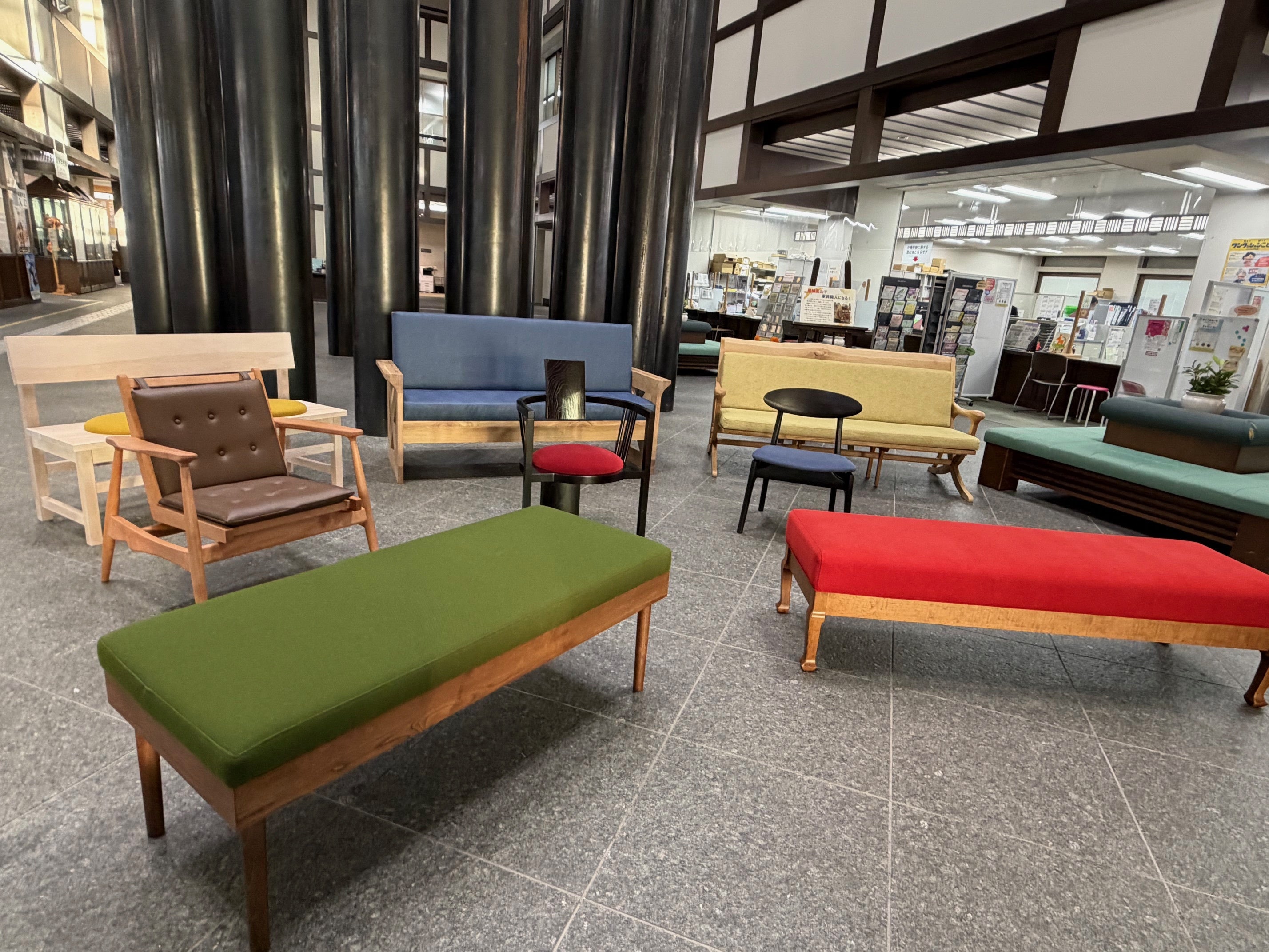 家具の六大産地の一つである飛騨高山。また、国指定の伝統的工芸品である「一位一刀彫」や「飛騨春慶」などのほか、個人のクラフト作家も数多く活躍している飛騨高山を今一度、市民の皆さんに認識していただくため、市役所の1階ロビーで実際に利用いただけるベンチや椅子を岐阜県立木工芸術スクールの生徒の皆さんに製作いただきました。