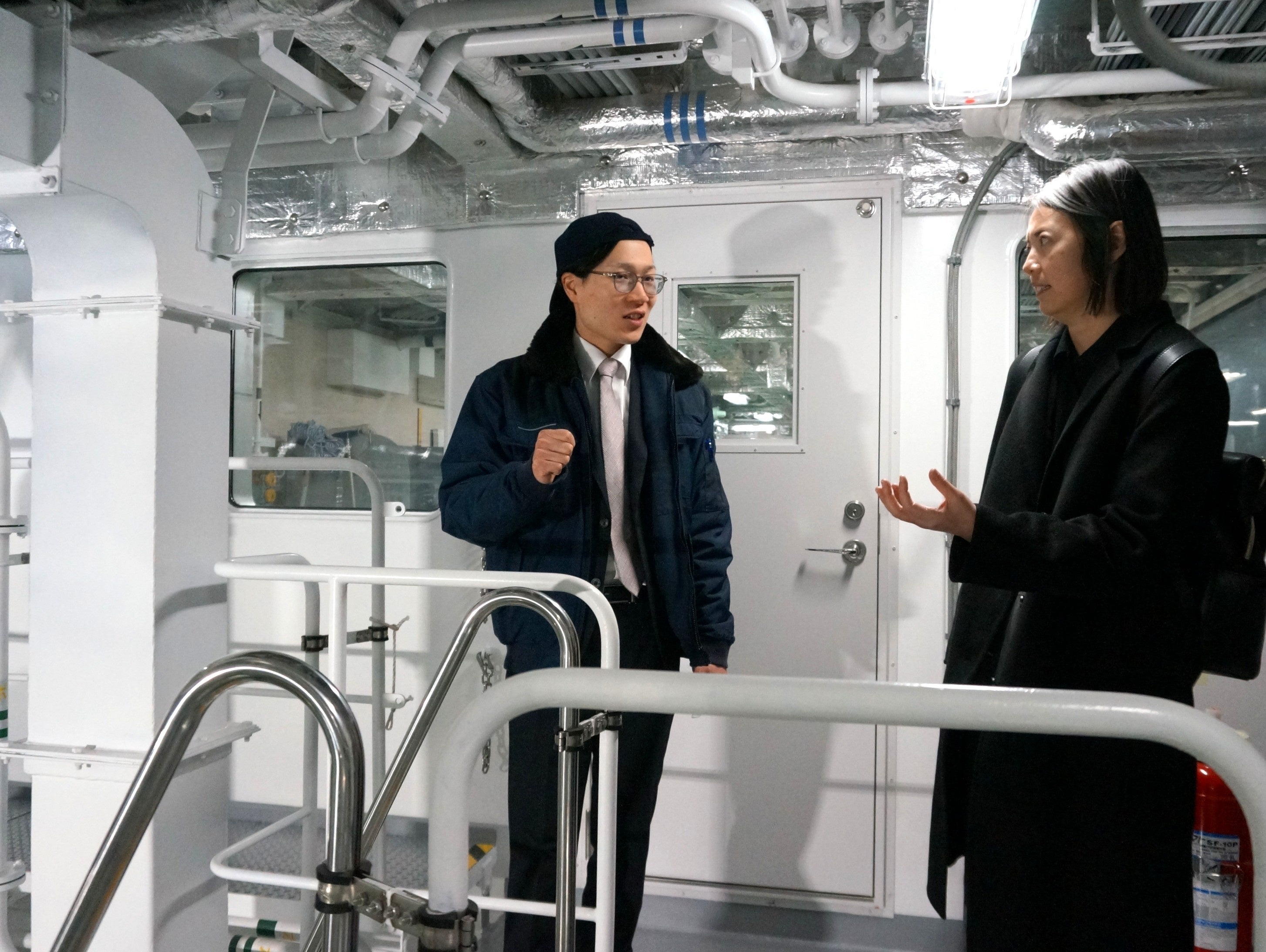 中村一等機関士(左)に質問するワン首席領事(右)