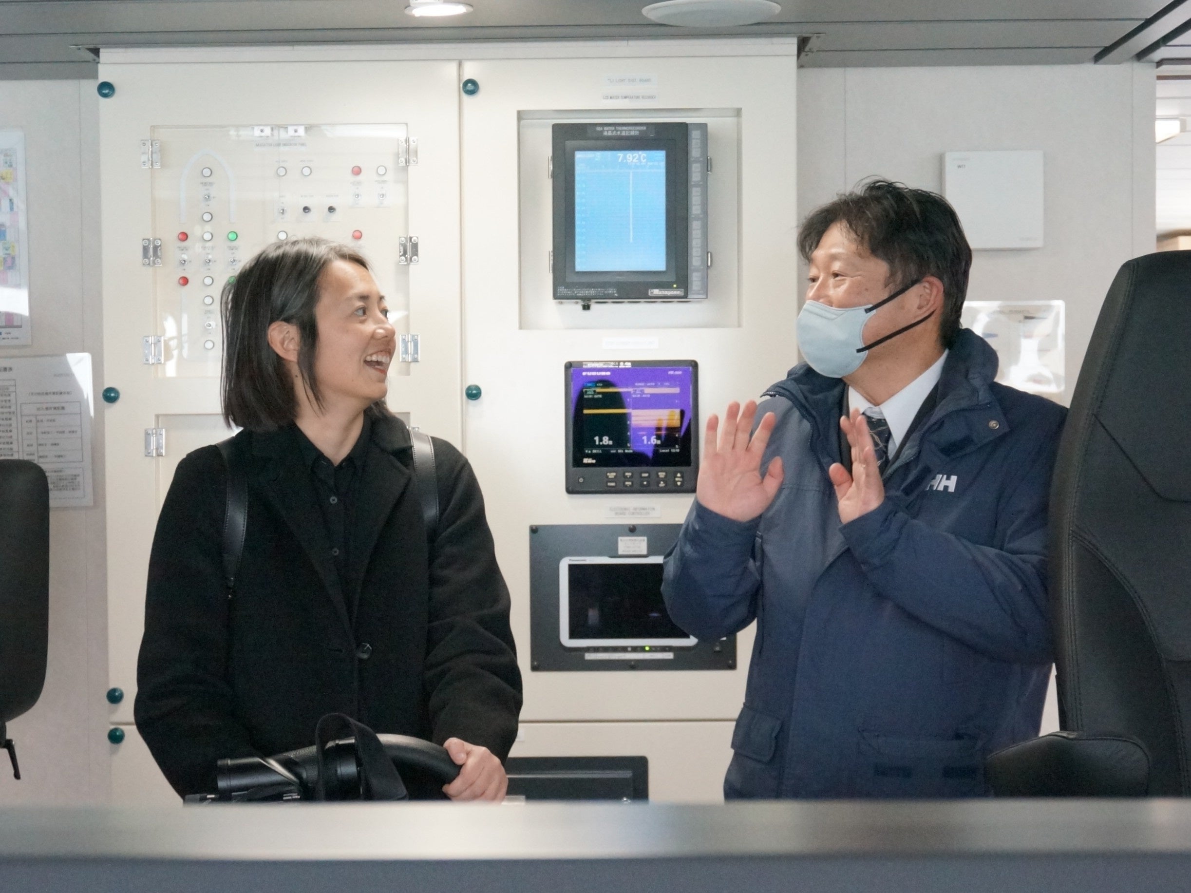練習船「鳥羽丸」の船橋において、ワン首席領事(左)が齊心船長(右)から説明を受ける様子