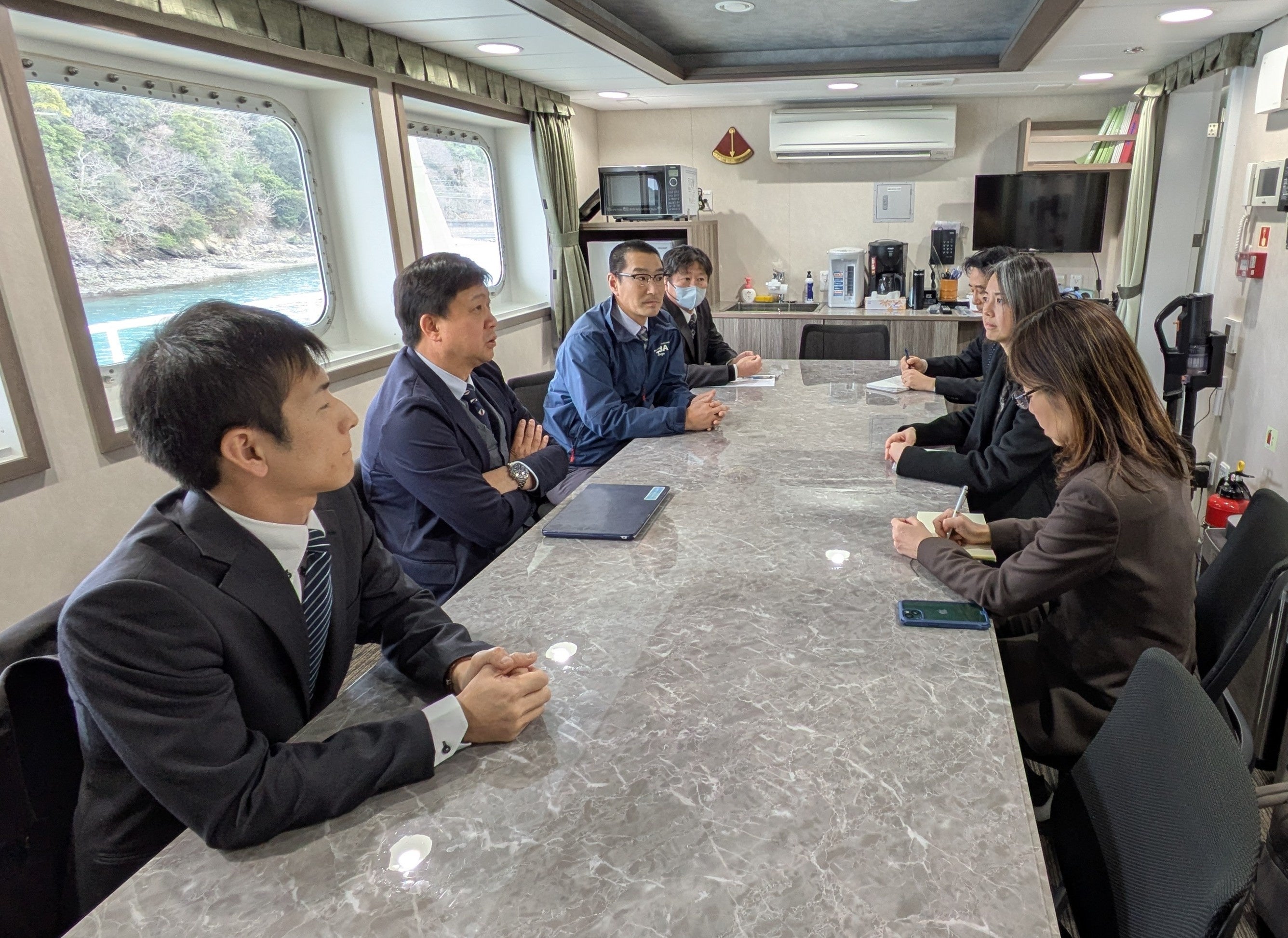 意見交換の様子(左から時計回りに、亀谷准教授、江崎副校長、鎌田商船学科長、齊心船長、在名古屋米国領事館政治経済専門官、ワン首席領事、広報企画調整官)