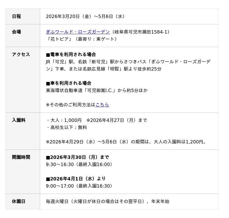 園内の広大な敷地内にある「花トピア」にて、第16回コンテストの優秀作品20点を展示します。世界中の子どもたちが自然や生きものをしっかりと見つめ、真剣な思いを込めて描いた作品は、どれも魅力あふれるものばかりです。また、国や地域、年齢、表現方法など、作品一つひとつに個性が光ります。会場となるぎふワールド・ローズガーデン(岐阜県可児市)には、国内外の多彩な品種のバラがおよそ6,000品種、20,000株植栽されています。また、ネモフィラやひまわりなど四季折々の花を堪能できるだけなく、大型複合遊具をはじめ親子で楽しめる施設も豊富です。